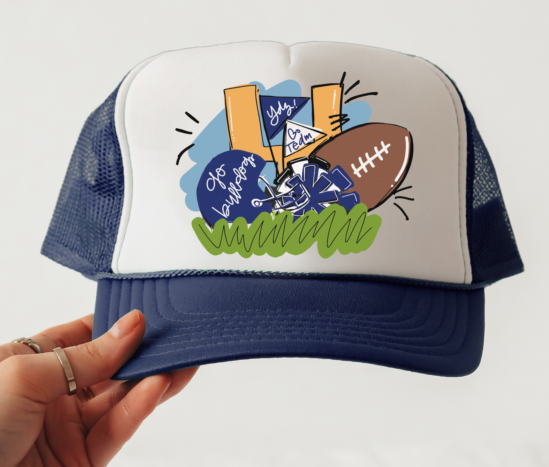Custom trucker ballcap. Ballcap and design color can be changed.