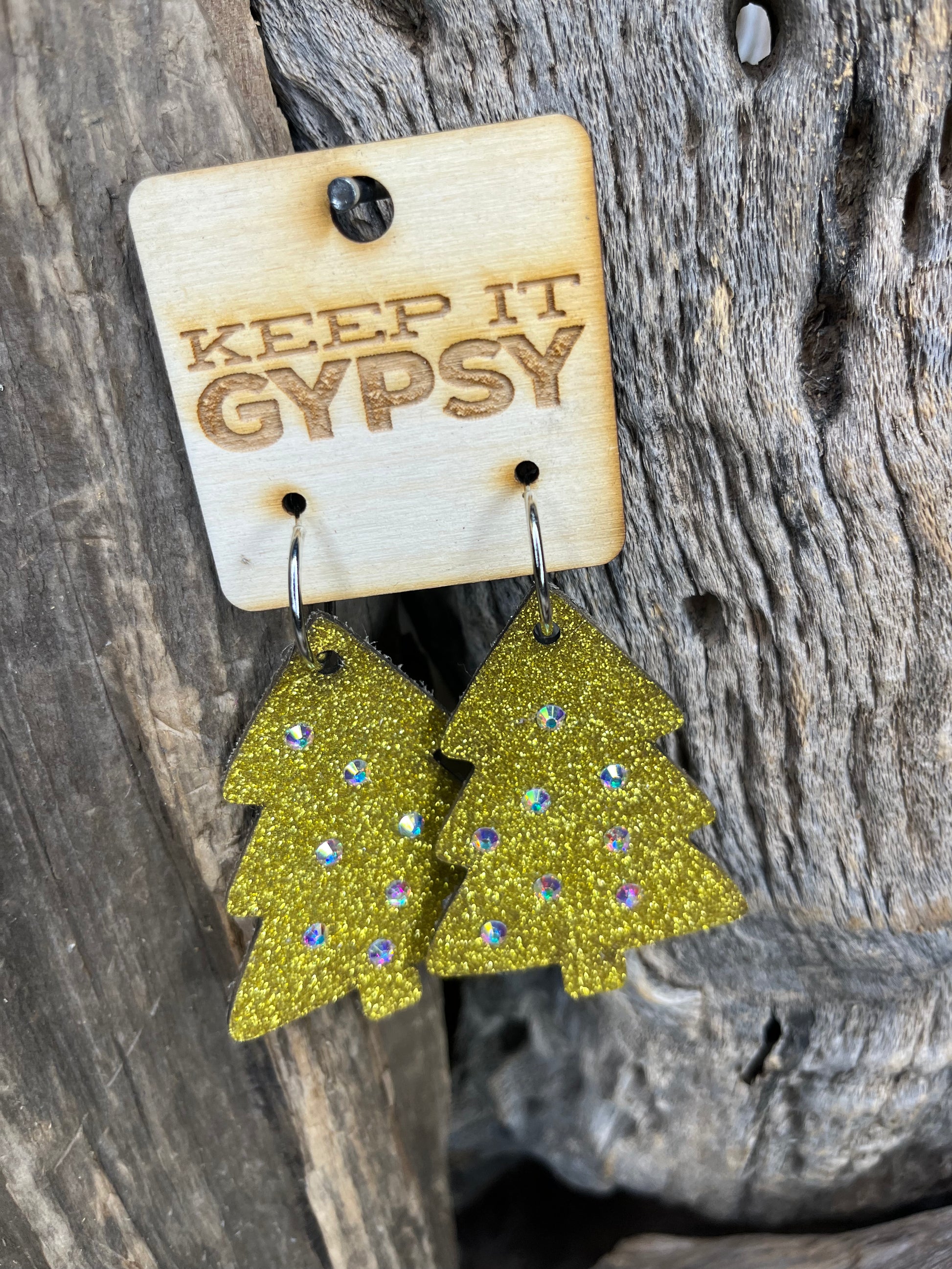 Silver Glitter Tree Earrings with AB crystals and Silver Hoops. Christmas Earrings made with Champagne Metallic on the back.