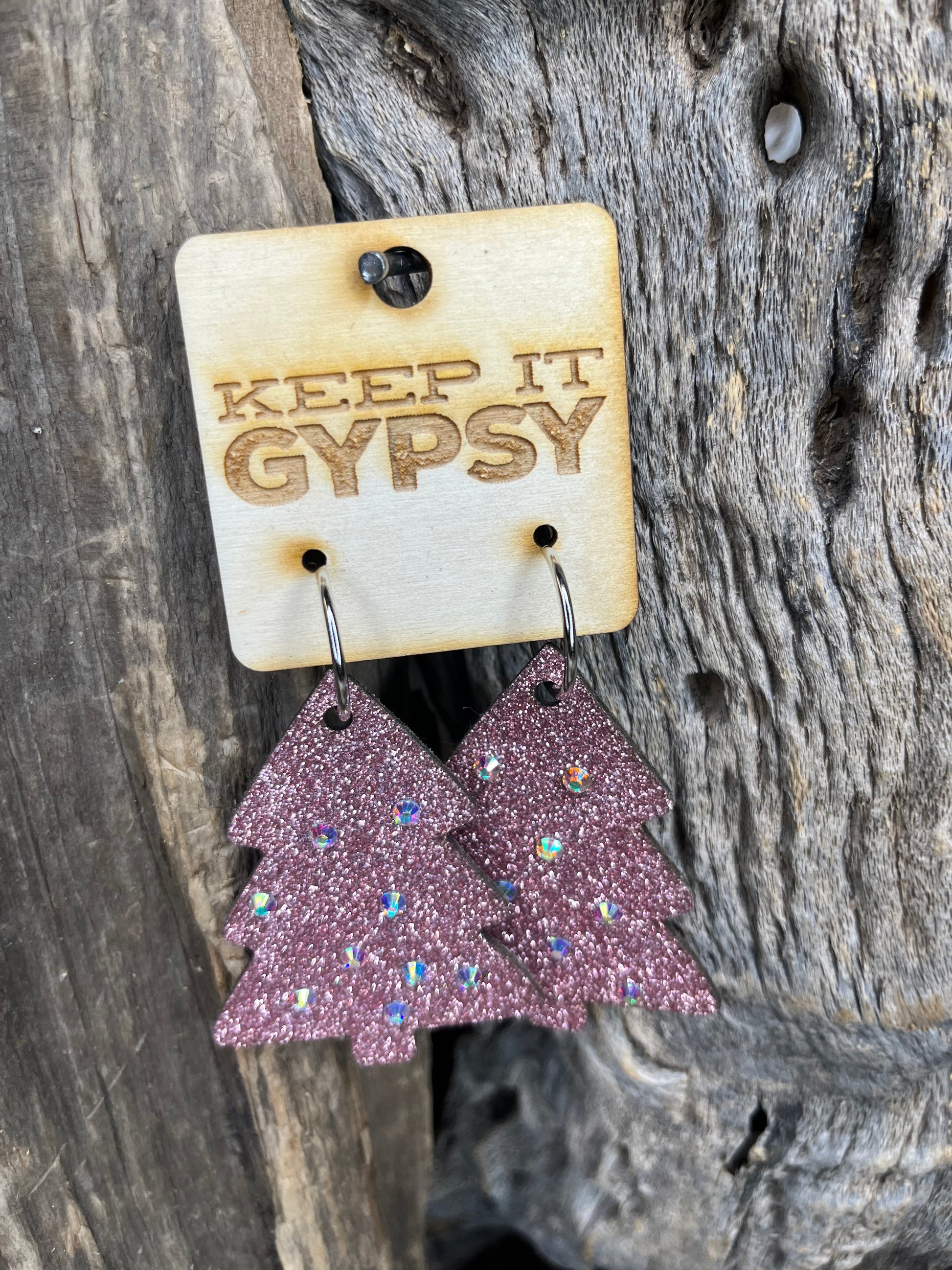 Pink Glitter Tree Earrings with AB crystals and Silver Hoops. Christmas Earrings made with Champagne Metallic on the back.