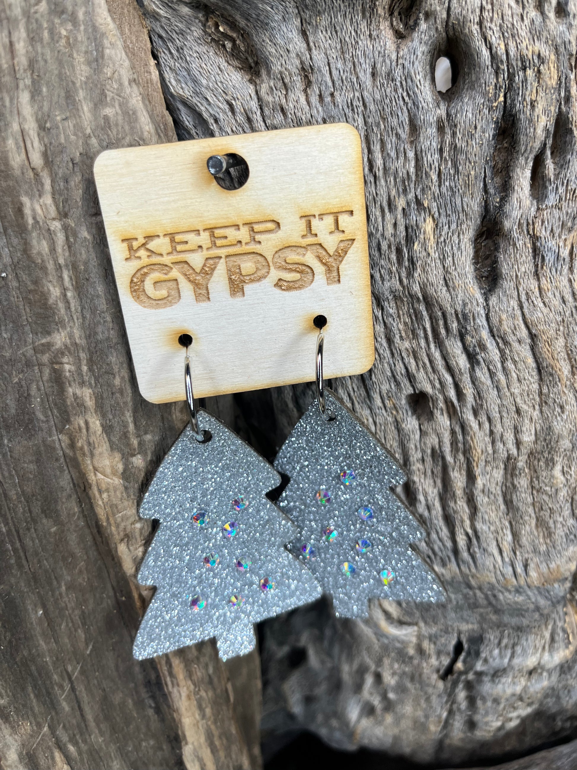 Silver Glitter Tree Earrings with AB crystals and Silver Hoops. Christmas Earrings made with Champagne Metallic on the back.