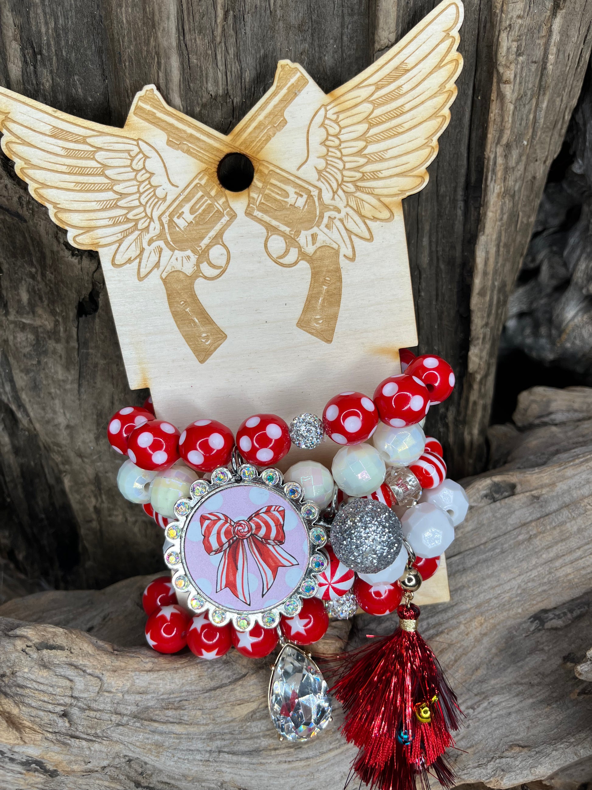 Christmas Stretch Bracelet Set with Candy Cane Bow Bezel