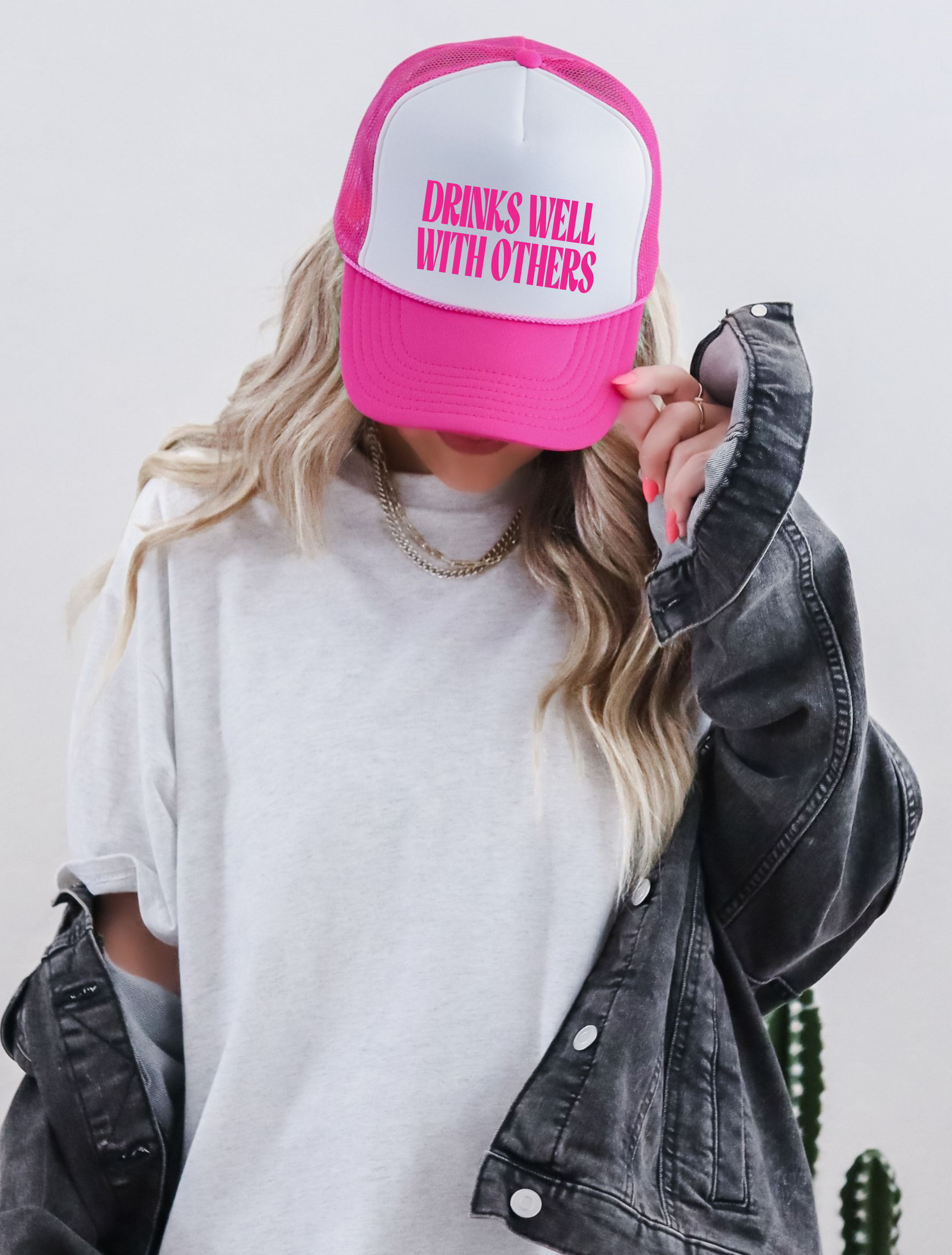 Drinks Well with Others TRUCKER CAP HOTPNKWHT